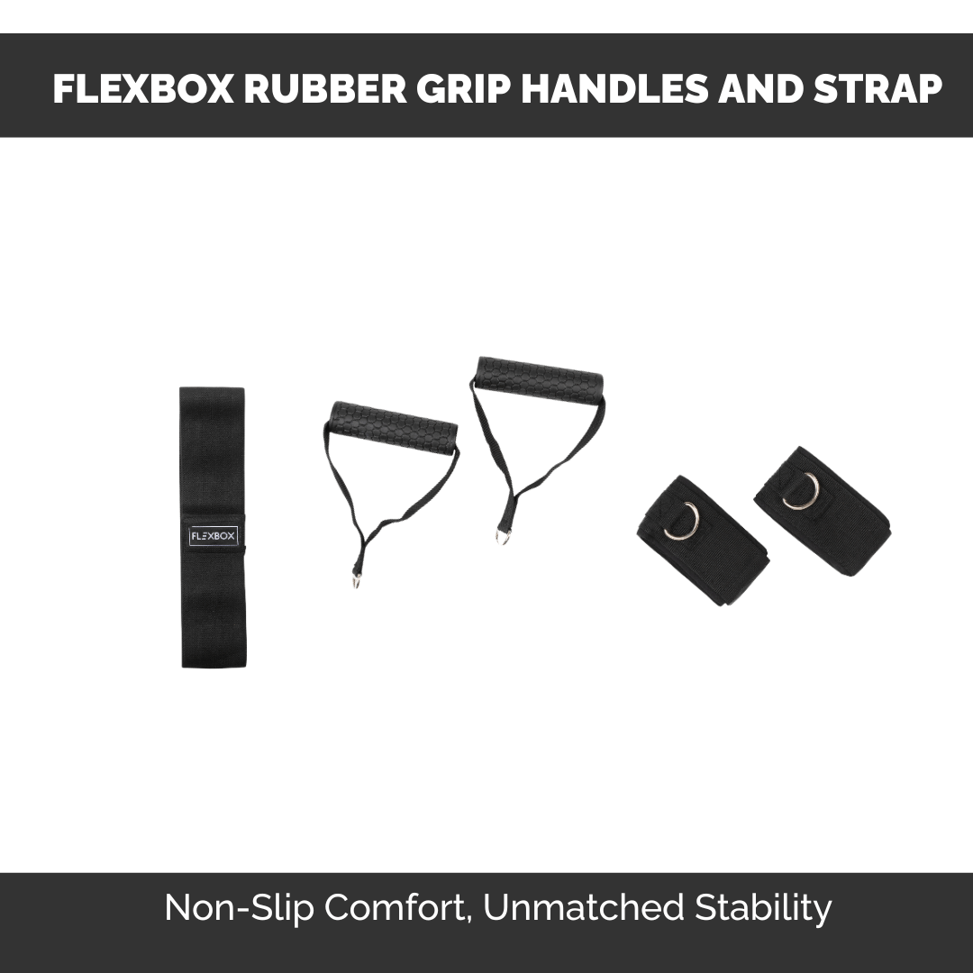 Elevate your workouts with the Flexbox Exercise Resistance Band Set, featuring three resistance tubes (light, medium, and heavy), high-quality rubber grip handles, ankle straps, and a fabric resistance band. This versatile set is stackable, making it perfect for resistance training, physical therapy, body shaping, yoga, Pilates, and home workouts. Ideal for both men and women, these bands come with a convenient carry bag for workouts on the go.