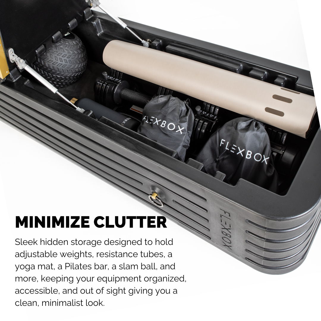 Wrapped in tufted vegan leather and brushed gold accents, Flexbox Elevate is designed to elevate your space and keep your space tidy. At first glance, it’s a sleek bench. Open the backrest (yes, it stays up for hands-free removal), and your entire home gym is revealed—organized and ready to go.