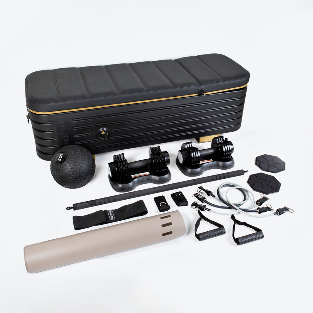- All-in-One Gym — Includes dumbbells, resistance tubes, slam ball, Pilates bar & more—all inside one sleek bench for total-body training.