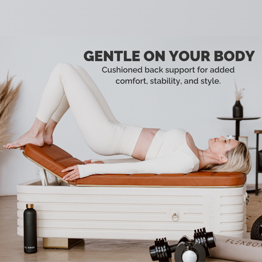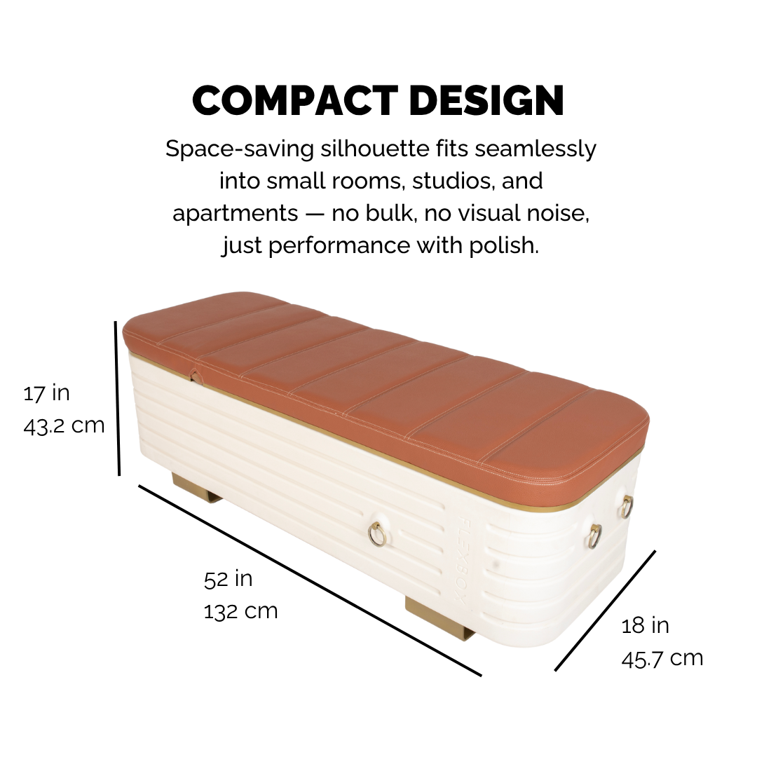 Wrapped in tufted vegan leather and brushed gold accents, Flexbox Elevate is designed to elevate your space and keep your space tidy. At first glance, it’s a sleek bench. Open the backrest (yes, it stays up for hands-free removal), and your entire home gym is revealed—organized and ready to go.